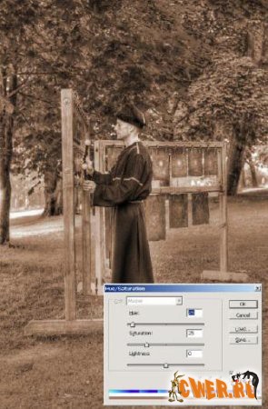 Для дальнейшей обработки накладываем корректирующий слой с фильтром Hue/Saturation в режиме Colorize (тонирование) и устанавливаем его прозрачность на уровне 70-75%. Поскольку тонирование выполнено отдельным слоем, то его параметры (цвет) всегда можно изменить, зайдя на этот слой. Осталось только кадрировать снимок и на этом работу можно считать завершенной.