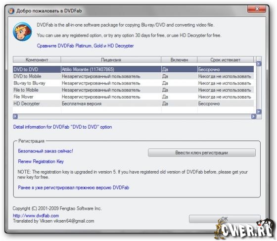 DVDFab Platinum – мощный, многофункциональный программный продукт для копирования DVD дисков с возможностями гибкой обработки видеопотока. Программа является одной из лучших на сегодняшний день, из инструментов для копирования, разбиения, пережатия и конвертирования DVD дисков с фильмами. Снимает все защиты и ограничения с диска и при желании пережмет диск большой емкости и вместит его в обыкновенную пустую DVD болванку с минимальными потерями качества (DVD9->DVD5) или разобъет фильм на два диска с полным переносом его меню, удалит всю рекламу, запишет только фильм и многое другое. Программа имеет интуитивно понятный, мультиязычный интерфейс включая русский.