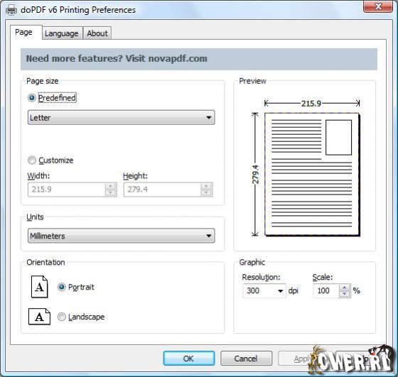 doPDF позволяет определить простые настройки печати в PDF, включая настраиваемое разрешение, масштаб страницы, а также предустановленные варианты размеров страницы и качества изображения.