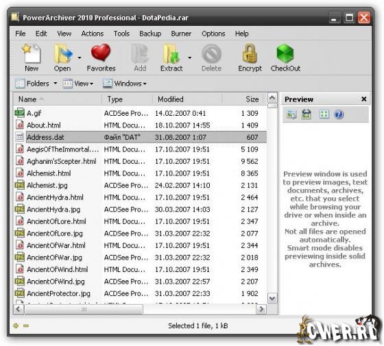 - Встроенный просмотрщик графических и текстовых файлов, находящихся в архивах (TXT, RTF, GIF, PNG, BMP, ICO, TIFF, GFI, SGI, EMF, WMF, PPM, Adobe Photoshop, Autodesk, Truevision, - ZSoft Кисть, Kodak Фото-CD, Jasc PaintShop Pro, Dr. Halo)