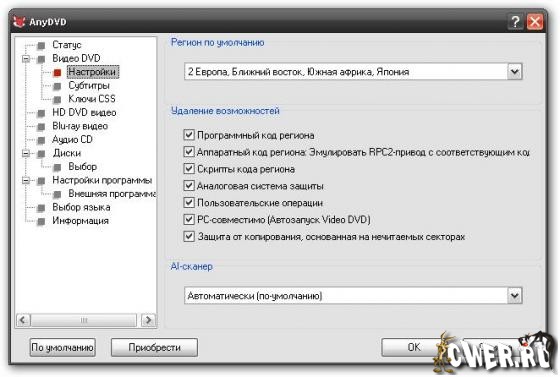 AnyDVD - программа для дешифрования CSS и снятия региональной защиты с любого DVD диска в любом DVD-ROM устройстве. Как насчет немедленного просмотра DVD видео на компьютере c DVD-ROM, региональный код которого не соответствует этому DVD диску, не переписывая его на жесткий диск целый час, используя специальные дешифрующие утилиты? AnyDVD обнаружит это несоответствие и автоматически снимет защиту. Это займет лишь пару секунд. Даже если ваш DVD-ROM не обеззонен, у вас есть возможность просматривать диски с любым региональным кодом.