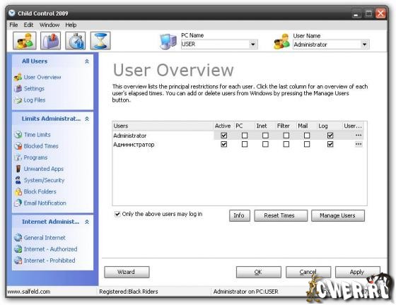 Child Control 2009 предназначена для родителей, желающих, чтобы их чадо меньше времени проводило за компьютером, а также для фильтрации открываемых в браузере интернет-страниц и контента. Есть возможность установки временного ограничения на работу компьютера или защиту паролем. Кроме этого, Salfeld Child Control позволяет запретить посещение нежелательных сайтов, а также заблокировать доступ к определенным дискам и папкам. Наконец, можно установить блокировку запуска тех или иных программ и внесение изменений в системный реестр. Программа ведет лог-файл всех событий. Настройки программы довольно гибкие и осуществляются в несколько шагов.