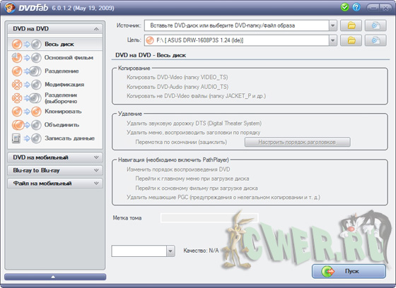 - Копировать на чистый DVD диск любого формата(DVD+R/RW, DVD-R/RW, DVD+R DL, DVD-R DL).