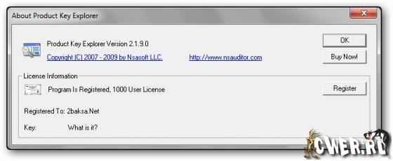 Product Key Explorer - позволяет расшифровать и увидеть, а также сохранить серийные номера (Product ID, Product Key, License Info, User Name, Company) продуктов Microsoft, CD-key установленных на компьютере программ, и не только их. Неполный список ПО, регистрационные данные которых можно увидеть и сохранить: Micrsoft Windows (2000, XP, 2003, Vista), Microsoft Office 2003, Microsoft Office 2007, Microsoft Office XP, Micrsoft Visual Studio 2005, Macromedia, Ahead Nero, Adobe Photoshop, CyberLink PowerDVD, Borland Delphi и т.д.