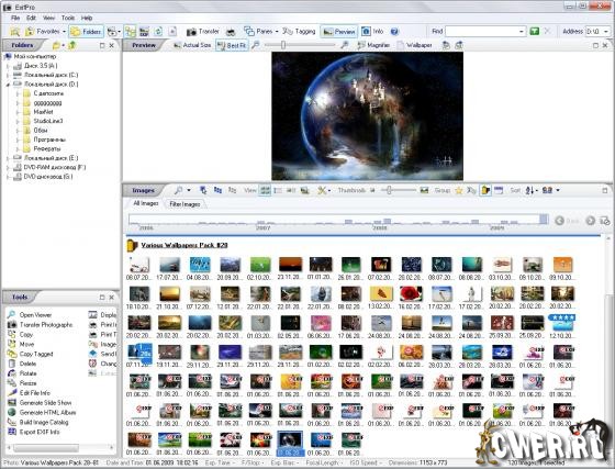 ExifPro - приложение, предназначенное для отображения, обработки и просмотра фотографий. Программа позволяет отображать изображения в нескольких режимах. Выделенные изображения вы сможете копировать, изменять в размерах, обрезать и всячески настраивать, используя инструменты, встроенные в программу. Также данная программа позволяет отображать EXIF информацию, встроенную в фотографии, описывающей различные параметры фотокамеры, которая была использована во время снимка. С помощью программы можно создавать HTML альбомы, слайд-шоу, с использованием встроенных в программу генераторов, печатать изображения, добавлять описания и теги к изображениям. Отдельное окно просмотрщика предлагает пользователю инструменты для масштабирования и панорамирования, коррекции цвета и вида изображений, инструмент лупы и режим слайд-шоу.