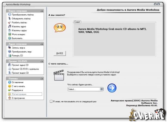 Неуклонно возрастающее число желающих использовать компьютер для работы с цифровым фото и видео говорит о том, что, возможно, уже в недалеком будущем вместо привычных фотоальбомов гостям будут предлагать посмотреть DVD с фотографиями и видео прошедших лет. Для того чтобы разобраться в тонкостях обработки фото и видео материала необходимо иметь достаточно много свободного времени и обладать железной выдержкой, которая бы позволяла сохранять спокойствие после очередной "недопустимой операции" в Adobe Premierre. Если ни первого, ни второго у вас нет, выход один - воспользоваться менее сложным программным обеспечением, с помощью которого вы сможете редактировать отснятый материал. Такая утилита должна содержать универсальный набор инструментов, для основных операций - резки и склейки видео, конвертирования в другой формат и т.д. Примером такого "мультимедийного мини-комбайна" может служить Aurora Media Workshop. Несмотря на то, что интерфейс программы достаточно прост, разработчики постарались сделать программу еще понятнее для пользователя и сделали мини мастер Getting Started. Тут предлагается выбрать из списка операцию, которую вы хотели бы произвести в программе. Кроме этого, доступно несколько десятков советов, раскрывающих возможности программы. Ознакомившись с ними, вы будете знать, как вам может пригодиться Aurora Media Workshop.