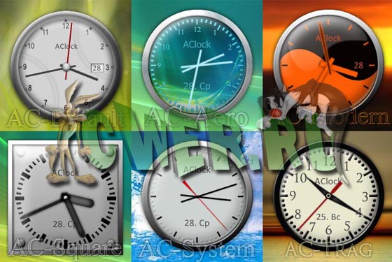 AClock – аналоговые часы на рабочий стол с поддержкой тем (скинов). AClock мало чем отличается от других программ подобного типа, и в то же время это совершенно другие часы. Начиная от тонкостей ресурсопотребления и заканчивая удобным редактором тем (скинов), в котором можно настроить абсолютно любую составляющую (стрелки, дату, надпись и пр.). Благодаря этому внешний вид Ваших часов зависит только от Вашей фантазии и уровня владения Photoshop.