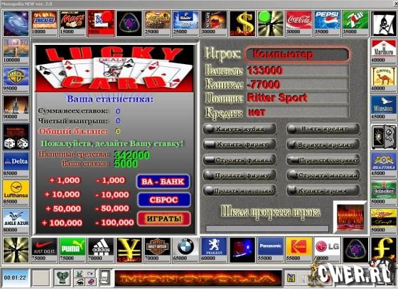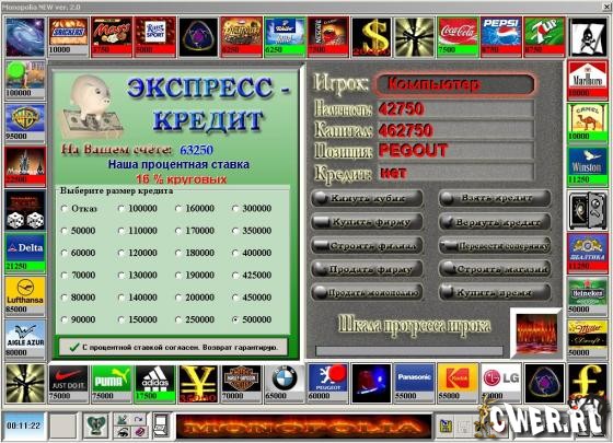 Игра предназначена для двоих человек, а также, в случае отсутствия соперника, можно посостязаться в игре с Компьютером. В начале каждой игры игроки уже имеют наличную сумму денег в размере 250 тысяч уе. Но не начальный капитал! Капитал Вы должны заколотить сами в течение всей игры. Учитывая, что подобного рода игры могут продолжаться до бесконечности, то процесс игры разделен на два этапа.