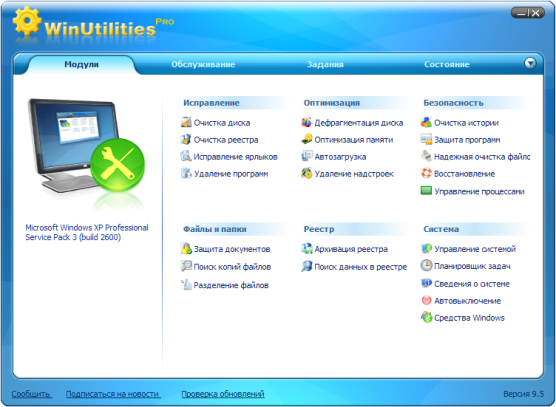 WinUtilities - набор утилит, предназначенных для настройки операционных систем семейства Windows. WinUtilities позволяет находить и удалять критические неисправности, неправильные ссылки и ключи в реестре, поможет правильно удалить приложения и программы, а также очистит историю интернета, cookies и многое другое. Также в программе есть возможность настроить автозапуск программ и изменять скрытые опции ОС.