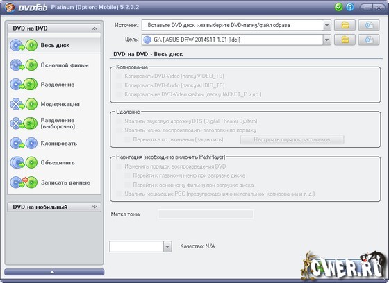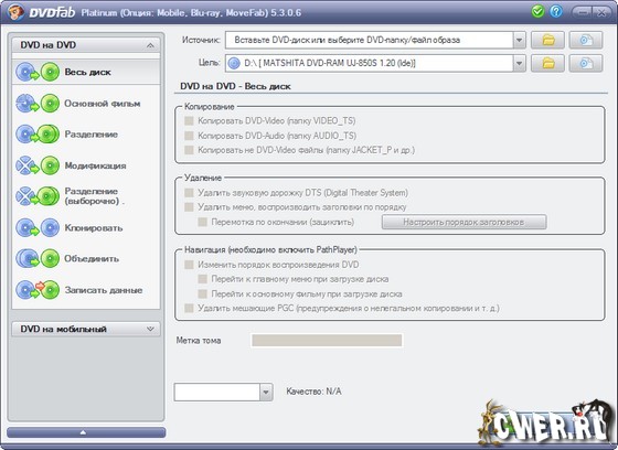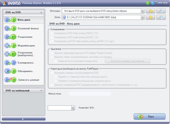 DVDFab Platinum – мощный, многофункциональный программный продукт для копирования DVD дисков с возможностями гибкой обработки видеопотока. Программа является одной из лучших на сегодняшний день, из инструментов для копирования, разбиения, пережатия и конвертирования DVD дисков с фильмами. Снимает все защиты и ограничения с диска и при желании пережмет диск большой емкости и вместит его в обыкновенную пустую DVD болванку с минимальными потерями качества (DVD9->DVD5) или разобъет фильм на два диска с полным переносом его меню, удалит всю рекламу, запишет только фильм и многое другое. Программа имеет интуитивно понятный, мультиязычный интерфейс включая русский.