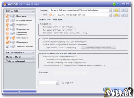 Мощный, многофункциональный программный продукт для копирования DVD дисков с возможностями гибкой обработки видеопотока. Программа является одной из лучших на сегодняшний день, из инструментов для копирования, разбиения, пережатия и конвертирования DVD дисков с фильмами. Снимает все защиты и ограничения с диска и при желании пережмет диск большой емкости и вместит его в обыкновенную пустую DVD болванку с минимальными потерями качества (DVD9->DVD5) или разобъет фильм на два диска с полным переносом его меню, удалит всю рекламу, запишет только фильм и многое другое. Программа имеет интуитивно понятный, мультиязычный интерфейс включая русский.