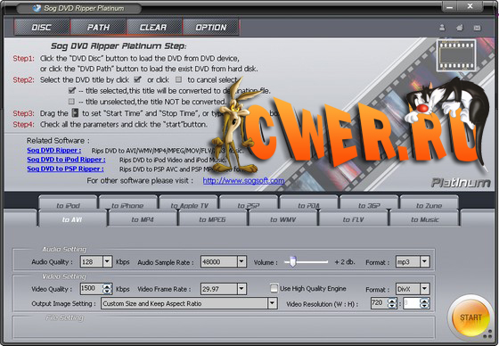 Sog DVD Ripper Platinum является решением для конвертирования DVD или в AVI, DivX Xvid MPEG1/2 MPEG-4 WMV FLV (Flash Video), DVD для IPod, iPhone, AppleTV, PSP на DVD, DVD на мобильный телефон (3GP), или извлечения из DVD аудио в MP3 музыкальном формате, так, чтобы вы смогли проигрывать на PC, IPod, iPhone, Apple-TV, MP4-плеер, PSP, Мобильном Телефоне, Zune, PDA. Он поддерживает все коммерческие DVD и снимет все ограничения DVD (CSS, регион, RCE, Sony ARccOS и т.д.)