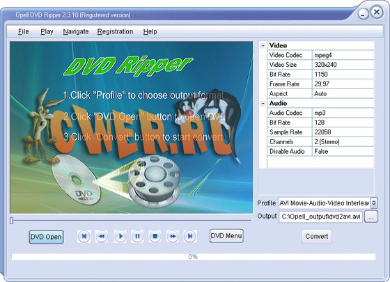 Opell DVD Ripper - мощная и одновременно простая в использовании программа для создания копий DVD. Кроме этого, Opell DVD Ripper позволяет преобразовывать DVD в форматы ASF, AVI, DivX, FLV, MOV, MP3, MPEG, SWF, WMA, XviD. Подддерживается пакетная обработка файлов, преобразование каждой части в отдельный файл, сохранение аудиоданных с DVD в *.mp3, *.ogg или *.wma, гибкие настройки (в т.ч. качества копии), автоматическое выключение компьютера после завершения задачи и многое другое. В связи с несложностью интерфейса хорошо подходит для домашнего использования.