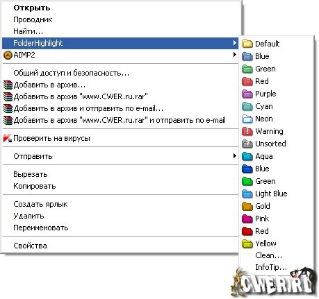 FolderHighlight - утилита для выделения особых папок любым цветом. Мы принимаем около 80% всей информации визуально, глазами. При просмотре десяток визуально-похожих папок, пользователь не использует свое зрение в полном объеме, таким образом ваша деятельность становится менее эффективной, чем могла бы быть. Но если каждой папке придать свой цвет или особую иконку, то соответственно нужные папки быстрее бросаются в глаза и эффективность в работе возрастает. Для решения этой актуальной проблемы была создана программа FolderHighlight, которая поможет вам быстро и легко изменять цвет или иконку папки напрямую из контекстного меню проводника. Последние версии программы поддерживают Windows Vista и Windows 7.