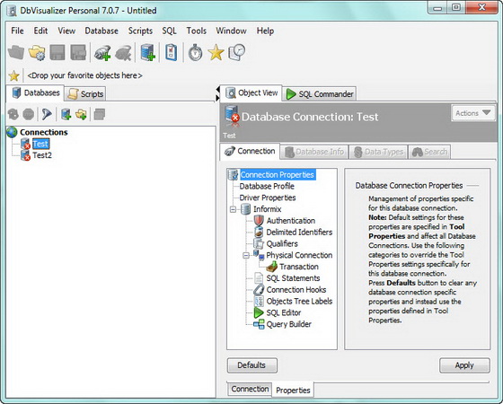 DbVisualizer - межплатформенный инструмент для работы с базами данных, который представляет собой универсальное решение для быстрой разработки, тестирования и администрирования реляционных баз данных. Он предлагает разработчикам целый ряд инструментов, обеспечивающих помощь в разработке баз данных и выполнении таких задач, как просмотр объектов, создание и запуск SQL-скриптов, а так же просмотр и редактирование данных. Программа поддерживает все основные коммерческие базы данных, включая Oracle, DB2, Mimer, SQL Server, Sybase ASE, Informix и альтернативные базы данных с открытыми исходными кодами, такие как MySQL, PostgreSQL и JavaDB/Derby.
