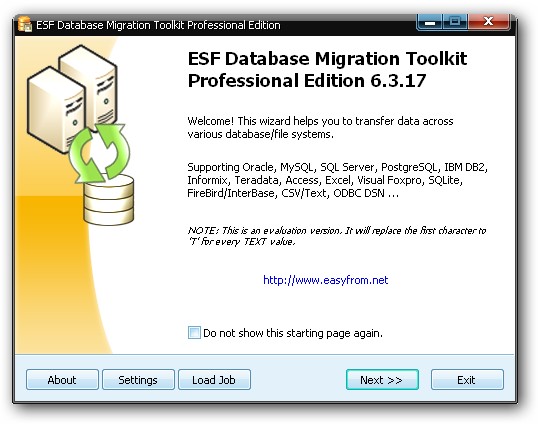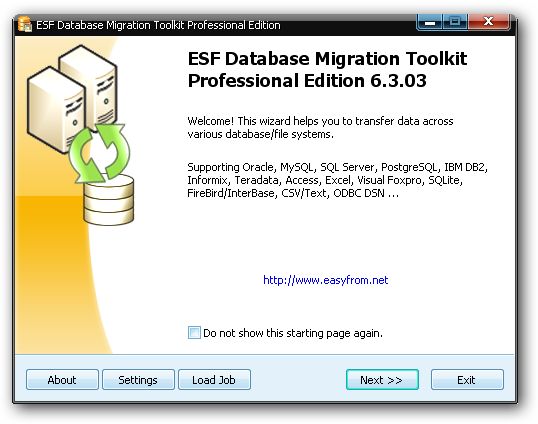 ESF Database Migration Toolkit – программа, позволяющая вам конвертировать различные форматы баз данных. Программа может связываться непосредственно с MySQL, SQL Server, PostgreSQL, Oracle, Access, Excel, Paradox, Lotus, dBase, Visual FoxPro, Text и другими форматами, конвертировать их друг в друга (Сервер SQL для MySQL, MySQL to Access и т.п.). Данная программа содержит простой пошаговый мастер, который поможет вам связаться с целевой базой данных, выбрать таблицы, а затем конвертировать или копировать их в указанное место.