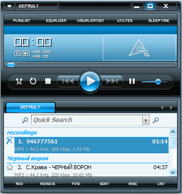 Отличный плеер MP3 российской сборки,не глючный,абсолютно бесплатный,что ещё надо для счастья? А вот со сменой внешнего вида были проблемы.С установкой этой проги вы получаете в распоряжение 48 сменных скинов,да и установка не займёт много времени,так как все шкуры будут находиться в меню"обложки"