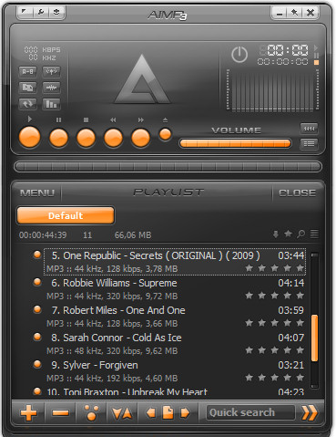 AIMP - программа, которая разрабатывалась как аналог всем известного медиаплеера Winamp. На данный момент программа включает в себя множество дополнительных модулей: CD-Ripper, Tag Editor, Audio-player, аудио конвертер, запись аудио и дисков с данными и многое другое. AIMP заменяет множество программ, благодаря чему теперь не нужно искать специальный софт, скажем, для перегона Audio-CD в MP3 - это уже предусмотрено в AIMP. Программа позволяет воспроизводить без плагинов множество форматов, включая WAV, MP3, MP2, MP1, OGG, WMA, UMX и многие другие. Интерфейс программы выглядит очень стильно, а также имеет многоязычную поддержку, включая русский язык.