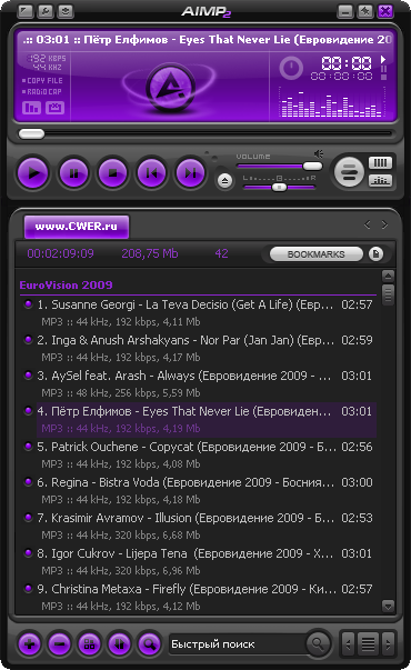 AIMP - программа, которая разрабатывалась как аналог всем известного медиаплеера Winamp. На данный момент программа включает в себя множество дополнительных модулей: CD-Ripper, Tag Editor, Audio-player, аудио конвертер, запись аудио и дисков с данными и многое другое. AIMP заменяет множество программ, благодаря чему теперь не нужно искать специальный софт, скажем, для перегона Audio-CD в MP3 - это уже предусмотрено в AIMP. Программа позволяет воспроизводить без плагинов множество форматов, включая WAV, MP3, MP2, MP1, OGG, WMA, UMX и многие другие. Интерфейс программы выглядит очень стильно, а также имеет многоязычную поддержку, включая русский язык.