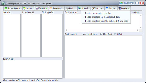 Программа для автоматического обнаружения и записи переговоров, ведущихся в локальной сети на всех компьютерах с помощью интернет-пейджеров ICQ, MSN, AOL (AIM) и Yahoo, причем записываться может весь чат, включая включая цвет и шрифт текста, смайлики и т.п. Имеется опция поиска по записанному логу, при желании он может быть преобразован в формат RFT. Незаменимый инструмент для начальников, желающих узнать, о чем сотрудники общаются в рабочее время по ICQ, а также недоверчивых мужей и заботливых родителей. Программа устанавливается только на один компьютер в сети, после чего собирает информацию об IM-клиентах, установленных на других ПК, и перехватывает все разговоры, которые ведутся с их помощью. По записанным разговорам можно выполнять поиск. Кроме этого, доступна возможность чтения разговоров вслух. Доступ к программе, а также ее настройки защищаются паролем, поэтому отключить ее, не зная пароля, не получится.
