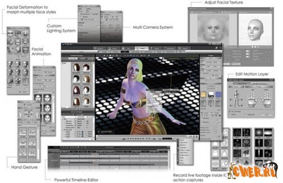 В ней пользователи могут найти уже готовых 3D-персонажей, а также все, что нужно для создания их виртуального жизненного пространства – одежду, реквизит, ландшафты. В iClone есть также большая библиотека движений, которые можно задавать персонажам.