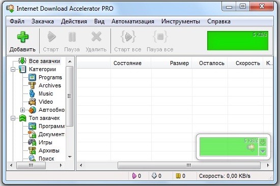 Internet Download Accelerator - простой, но эффективный менеджер загрузок, позволяющий не только скачивать файлы по HTTP и FTP протоколам, но позволяющий повысить скорость загрузки в несколько раз. Программа разбивает файл на несколько частей и скачивает их одновременно, что позволяет добить большого прироста производительности. Кроме того, IDA позволяет восстанавливать прерванную загрузку, отслеживать клики в Internet Explorer и следить за буфером обмена, работать по расписанию и т.д.
