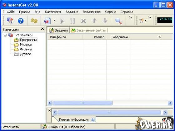InstantGet - наверно самый простой в использовании менеджер закачек, но при этом имеющий все функции своих "старших собратьев". Поддерживается докачка файлов после разрыва связи, используется многопоточная загрузка файлов (прирост скачивания увеличивается до 5 раз), имеется встроенный поиск...