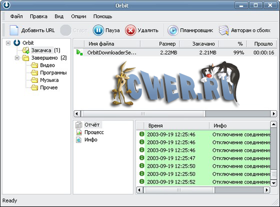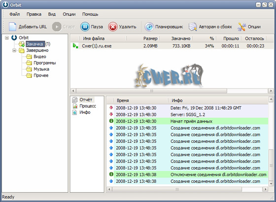 Orbit Downloader - менеджер закачек файлов из Интернета. Данная программа закачивает файлы в многопоточном режиме, поддерживает интеграцию с различными браузерами (Internet Explorer, Opera, FireFox и Maxthon), может закачивать файлы, расположенные в файлообменных сервисах, в частности, с RapidShare.com. Программа не требовательна к ресурсам компьютера. Orbit Downloader позволяет скачивать файлы по многим протоколам (HTTP, HTTPS, FTP, RTSP и MMS), может просматривать содержимое ZIP-файла до его скачивания и автоматически загружать файлы по расписанию, а также имеет расширенные настройки для работы через прокси-сервер.