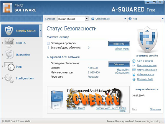 a-squared Anti-Malware - новая версия антивирусного пакета. Этот антивирус специализируется на поиске и удалении таких разновидностей вредоносных программ, как: трояны (Trojans), интернет-черви (Worms), шпионы (Spyware), звонильщики (Dialers). После своей инсталляции программа прописывает пункт в контекстном меню Проводника, в результате чего появляется возможность быстрого вызова функции проверки выбранных объектов. В настоящее время в антивирусной базе содержится более 50 тысяч сегментов вирусного кода. Следует отметить надёжность и высокую скорость работы антивирусного сканера, входящего в состав этого антивирусного пакета.