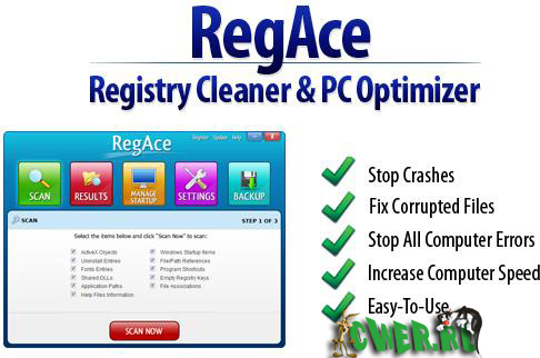 RegAce - один из самых новых уборщиков системного реестра в интернете, используя часть наиболее новейшей техники, чтобы убрать диапазон проблем от вашего компьютера.
