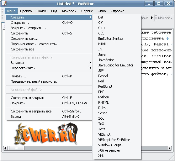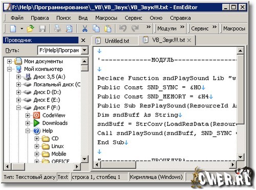EmEditor - отличный текстовый редактор для программистов, веб-дизайнеров и обычных пользователей с очень большими возможностями: настраиваемый тулбар, отдельная панель макросов (в качестве макросов могут выступать также JavaScript и VBScript), запись движений мыши и клавиатурного набора, открытие файлов даже не большого, а огромного размера, работа сразу с несколькими файами, подсветка синтаксиса ASP, C#, C++, CSS, HTML, Java, JavaScript, JSP, Pascal (Delphi), Perl, Python, PHP, SQL, VBScript и др., поддержка подключения плагинов, расширенные опции поиска и т.д.