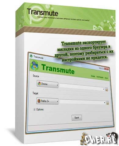 Transmute экспортирует закладки из одного браузера в другой, поэтому разбираться с их настройками не придется. С помощью Transmute закладки передаются из одной версии Firefox в другую (поддерживается как 2, так и 3), в Internet Explorer, Google Chrome и Opera. Нужно лишь выбрать исходный и целевой браузеры, и программа автоматически определит расположение закладок в каждом из них. А затем нажать на кнопку Export. При необходимости, Transmute переименует целевую папку и добавит к названию временную метку, что пригодится при создании резервных копий.