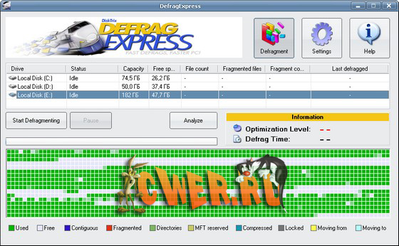 DefragExpress - программа, созданная с целью сделать уникальный и умный дефрагментатор, который сможет сделать процесс дефрагментации вашего жесткого диска как простым, так и быстрым, насколько это возможно. Метод дефрагментации, используемый DefragExpress разработан в DiskTrix Labs и является наиболее идеальным для дефрагментации жесткого диска. Программа очень проста в использовании и не требует знаний в области фрагментации файлов. Все что требуется - это сделать несколько кликов мышкой...