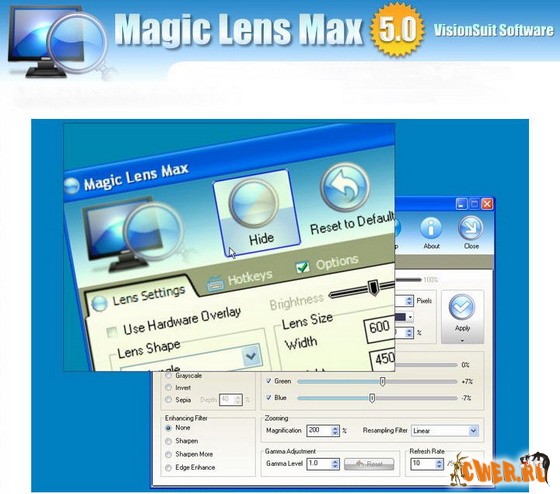 Magic Lens Max - уникальное средство просмотра изображений, которое позволит Вам изменять масштаб, вращать, расширять, рассматривать и фиксировать любую часть изображения вашего экрана. С помощью встроенных фильтров, Magic Lens Max быстро генерирует высококачественный линзовый (т.е. детальный) вид. Magic Lens Max также предоставляет возможность просмотра в разноцветном режиме или через разделенные цветные каналы.
