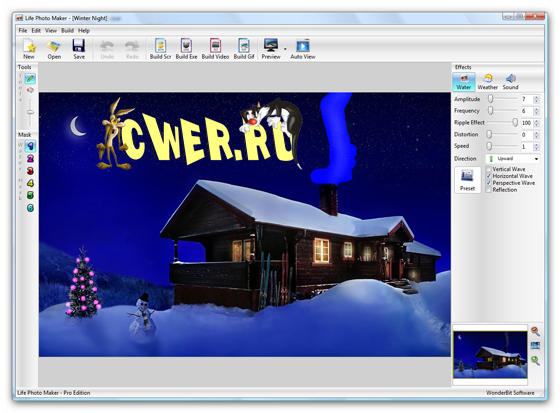 Life Photo Maker позволяет добавлять визуальные и звуковые эффекты к вашим фотографиям. Вы можете легко добавить водяные эффекты, такие как водопад, берег или озеро наложив водяную маску на ваши фото. Вы также можете добавить эффекты снега и дождя, а также до 8 каналов звуковых эффектов. Полученный результат можно сохранить в виде скринсейвера, видео (.avi), или анимированного изображения (.gif).
