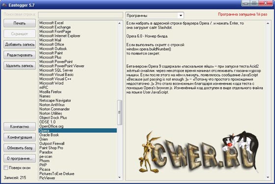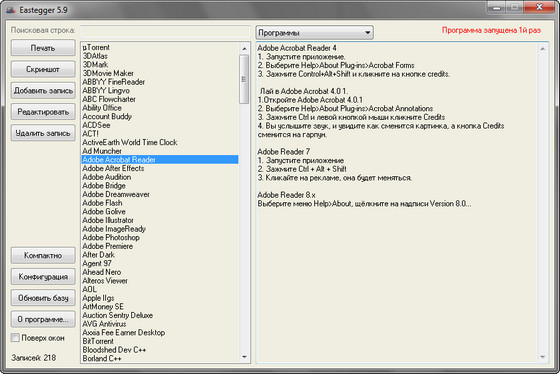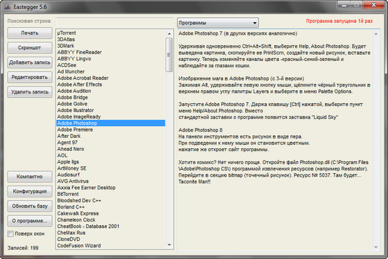 Известно, что у каждого есть свои секреты, это знают все. Вот и у каждой программы есть свои секреты. Eastegger здесь не исключение ;-). Эта программа содержит базу данных с описаниями пасхальных яиц (скрытых возможностей в программах), которые разработчики часто скрывают в своих творениях. В ней имеются секреты к большому числу программ, операционным системам, играм, мобильным телефонам, карманным компьютерам и с каждой новой версией этот список расширяется. База обновляется ежемесячно.