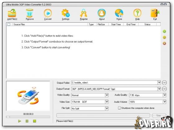 Ultra Mobile 3GP Video Converter - это мощный преобразователь 3GP. Позволяет вам конвертировать видео в формате DivX, XviD, AVI, WMV, MPEG, MP4, M4V, FLV, 3GP, ASF, RM, RMVB, MOV, ASX, MKV, OGM, SVCD, VCD, VOB в формат 3GP 3G2 H263 MP4, используемых в мобильных телефоннах и в других устройствах. Никакая другая программа не может преобразовать так много видео форматов. Выбор и настройка параметров конвертирования, нарезка и соединение отрезков с сохранением в выбранный формат, подключение кодеков, поддержка файлов с размером больше 2GB, высокая скорость и высокое качество, простой и удобный интерфейс.