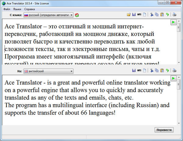 Ace Translator – программа для перевода любых текстов с иностранных языков на русский и обратно. Улучшенный механизм перевода гарантирует более высокое качество перевода благодаря обновленным лингвистическим алгоритмам.