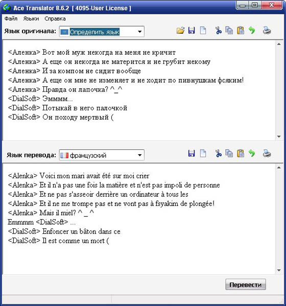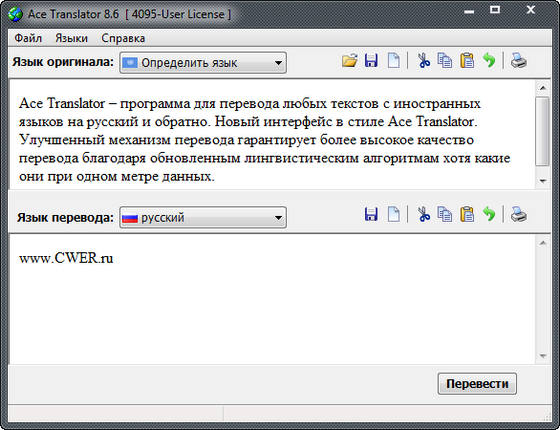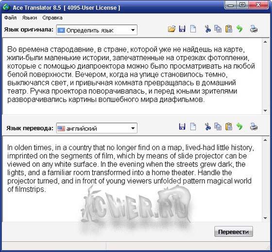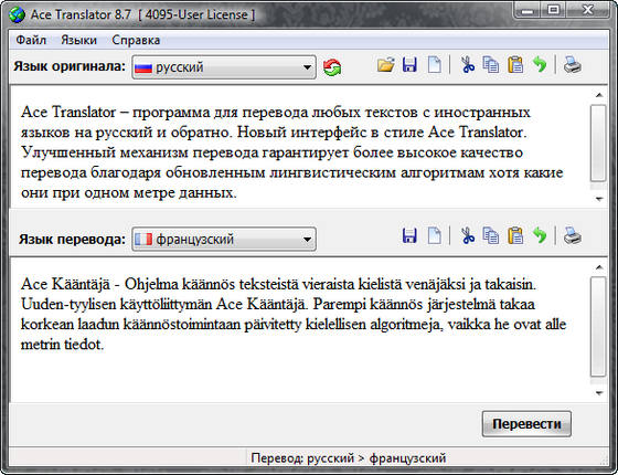 Ace Translator – программа для перевода любых текстов с иностранных языков на русский и обратно. Новый интерфейс в стиле Ace Translator. Улучшенный механизм перевода гарантирует более высокое качество перевода благодаря обновленным лингвистическим алгоритмам хотя какие они при одном метре данных.