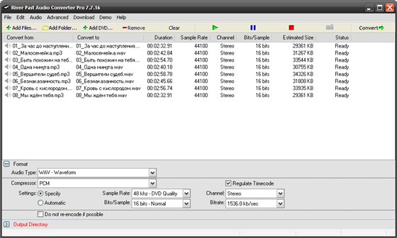 River Past Audio Converter Pro - программа для конвертирования аудиофайлов. В отличие от большинства программ данного класса, способных обрабатывать лишь небольшой набор форматов данных, River Past Audio Converter Pro позволяет открывать практически любой аудио и видео файл, для которого в системе установлены соответствующие кодеки. Программа будет полезна, например, для тех, кто хочет получить из APE WAV. Настройка качества звука для каждого конечного формата может производиться либо вручную с указанием разнообразных опций, либо в автоматическом режиме...