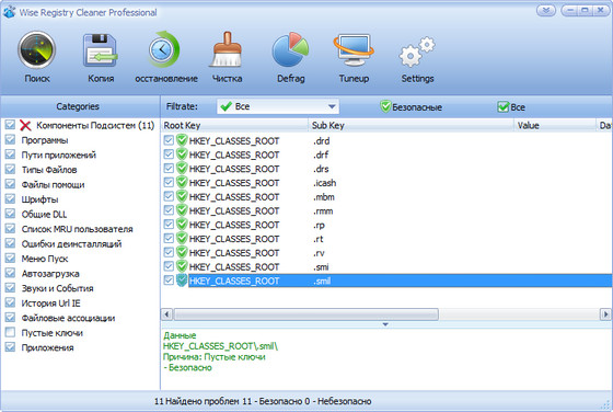 Wise Registry Cleaner - бесплатная версия безопасной утилиты для чистки реестра Windows. Программа сканирует реестр и ищет в нем некорректную и устаревшую информацию, после удаления которой операционная система работает более быстро. После того, как программа проанализирует проблемы вашей системы, вы можете сами просмотреть каждую найденную неполадку и посмотреть ее детальное описание. Все изменения, внесенные программой в реестр, могут быть отменены за два клика мышью. Также стоит отметить, что интерфейс программы переведен на множество языков, включая русский язык.