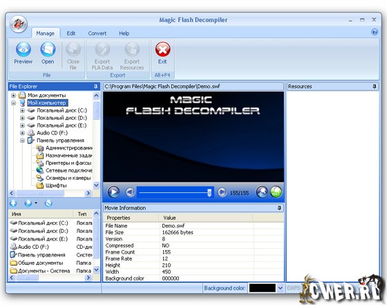 Magic Flash Decompiler - это профессиональный инструмент для работы с SWF файлами. Программа позволяет работать с ресурсами флеш-роликов. Изменять или редактировать графику, звуки, эффекты роликов и многое другое стало намного проще. Простой и быстрый инструмент для преобразования SWF в EXE. Как и любая другая программа в этом жанре, Magic Flash Decompiler позволяет извлекать SWF-элементы, такие как картинки, формы, звуки, шрифты, текст, кнопки, скрипты и спрайты из любого SWF-файла. Программа проста в использовании, поэтому подойдет любому пользователю.