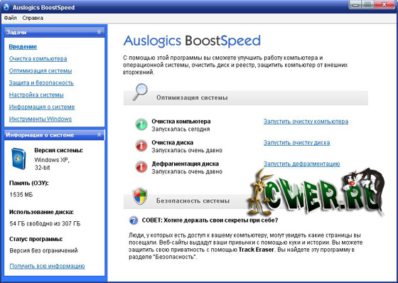 AusLogics BoostSpeed - популярная утилита для ускорения работы системы Windows, программ и Интернет-соединения от компании AusLogics. Программа оптимизирует компьютерную память, ускоряет загрузку Windows, повышает быстродействие Microsoft Office, The Bat, FireFox, Opera, Skype, чистит реестр и диск компьютера. Четвертая версия программы включает в себя знаменитый Auslogics Disk Defrag и набор новых утилит для современных компьютеров. После дефрагментации реестра BoostSpeed, скорость компьютера возрастет за счет уменьшения фрагментации файлов реестра, уменьшения их размера, а также благодаря устранению ошибок в реестре. Помимо этого данная программа предлагает мощные возможности очистки реестра и диска, что в свою очередь позволит вашему компьютеру работать более быстро и эффективно. Имеет приятный пользовательский интерфейс и поддержку русского языка