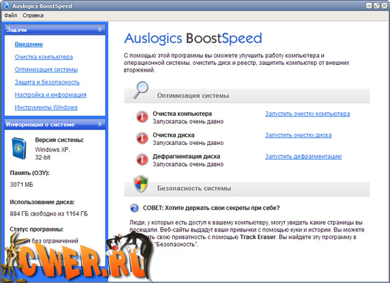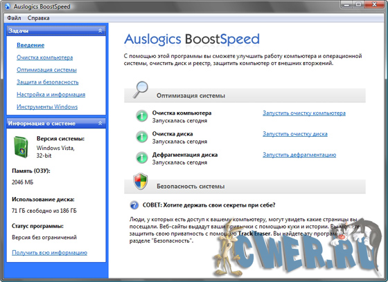 AusLogics BoostSpeed - единственная программа, которая позволит Вам быстро и качественно произвести настройку Вашей системы на максимальную производительность. Встроенный System Adviser проверит настройки Вашей системы с помощью 50 различных тестов и предложит Вам рекомендации по каждому тесту. Программа в реальном времени проверяет Вашу систему и если находит, что какой-то из параметров можно оптимизировать, то обязательно проинформирует Вас.
