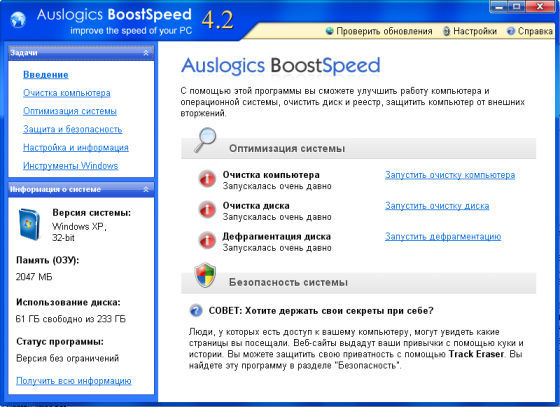 Программа оптимизирует компьютерную память, ускоряет загрузку Windows, повышает быстродействие Microsoft Office, The Bat, FireFox, Opera, чистит реестр и диск компьютера. После дефрагментации реестра BoostSpeed, скорость компьютера возрастет за счет уменьшения фрагментации файлов реестра, уменьшения их размера, а также благодаря устранению ошибок в реестре. Помимо этого, BoostSpeed предлагает мощные возможности по очистке системы, что в свою очередь позволит вашему компьютеру работать более быстро и эффективно.
