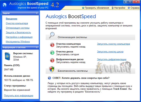 Обновилась популярная утилита для ускорения работы системы, программ и Интернет-соединения - BoostSpeed от компании AusLogics. Программа оптимизирует компьютерную память, ускоряет загрузку Windows, повышает быстродействие Microsoft Office, The Bat, FireFox, Opera, чистит реестр и диск компьютера. После дефрагментации реестра BoostSpeed, скорость компьютера возрастет за счет уменьшения фрагментации файлов реестра, уменьшения их размера, а также благодаря устранению ошибок в реестре.