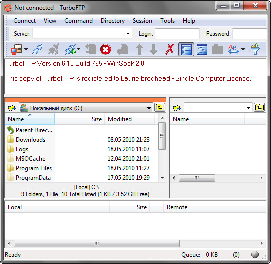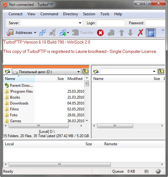 TurboFTP - защищенный FTP клиент с широкими функциональными возможностями, с помощью которого можно легко производить передачу файлов через Интернет. Программа позволяет вам передавать файлы, загружая или скачивая их, на высокой скорости между вашим компьютером и виртуальным FTP сервером с исключительной легкостью и, при необходимости, с возможностью шифрования передачи. Обладая простым и легким в использовании интерфейсом, с помощью данной программы пользователь сможет выполнять такие задачи, как загрузка веб сайта, планирование синхронизации и резервирования файлов и папок, а также критически важные корпоративные файловые передачи. Программой поддерживаются брандмауэры, в том числе HTTP прокси, SOCKS 4, SOCKS 4a и SOCKS 5, а также защищенные соединения SSL/TLS.