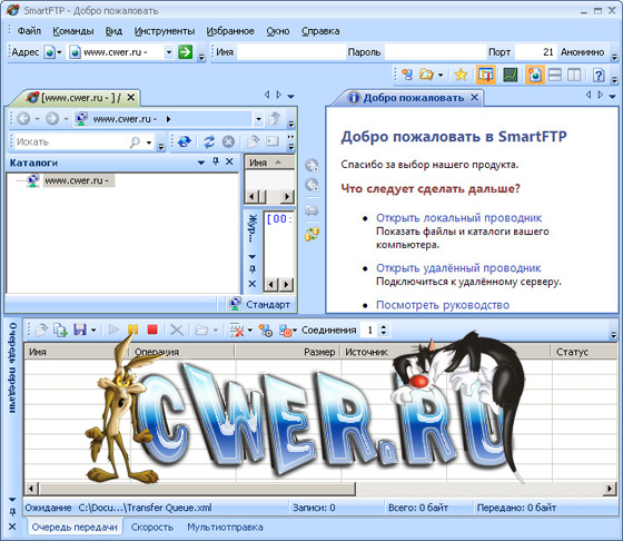 SmartFTP - FTP клиент, с легко настраиваемым эксплорероподобным интерфейсом и поддержкой тем Windows XP. В программе реализованы: многопоточная загрузка, докачка, работа через прокси и файрволы, SSL, FXP, операции Drag-n-Drop, работа по расписанию, ведение лог-файлов, просмотр подключаемых сайтов, закладки (Favorites) и возможность взаимодействия с Windows Commander 5.0.