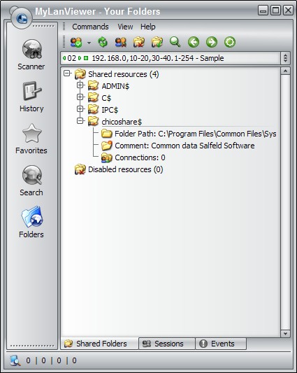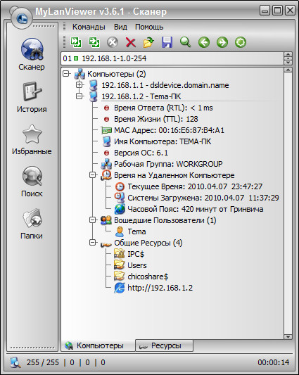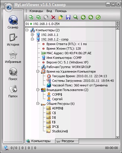MyLanViewer - программа для сканирования и мониторинга компьютеров в сети, с возможностью поиска общедоступных файлов в их общих ресурсах. Она показывает компьютеры в удобном для просмотра виде, который содержит имя компьютера, IP адрес, MAC адрес, общие ресурсы и другие детали для каждого компьютера. С помощью её вы можете следить за компьютерами в сети и получать оповещение, когда состояние одного из них изменится.
