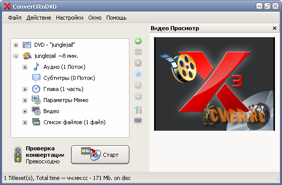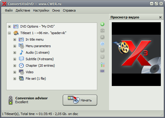 Вышла новая версия видеоконвертера ConvertXtoDVD. Программа предназначена для преобразования видео в формат, совместимый с DVD Video, и последующей записи содержимого на DVD. Программа поддерживает видеофайлы Mpeg, Mpeg, Mpeg4, MP4, VOB, WMV, DV, AVI, а также потоковое видео. Для работы программы не нужны внешние AVI-кодеки, поскольку она использует собственные. ConvertXtoDVD может автоматически создавать фрагменты (chapters), поддерживает наличие нескольких аудиодорожек, работает с субтитрами (.SRT .SUB/IDX .SSA). Также программа поддерживает создание несложного меню для DVD, в котором можно установить фон, выбрать цвет и другие параметры шрифта для надписей. Программа имеет русский интерфейс. Умеет конвертировать AVI, Mpeg, Mpeg4, DivX, Xvid, MOV, WMV, WMV HD, DV, MKV, DVD в DVD Формат изображения, автоматически определятся или предоставляется выбор вам. Версия 3 имеет полностью переписанный интерфейс с поддержкой подзаголовков и большим количеством новых параметров настройки.
